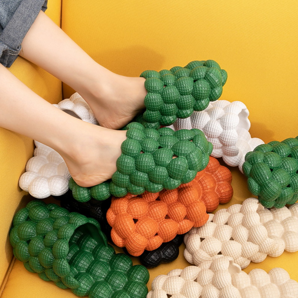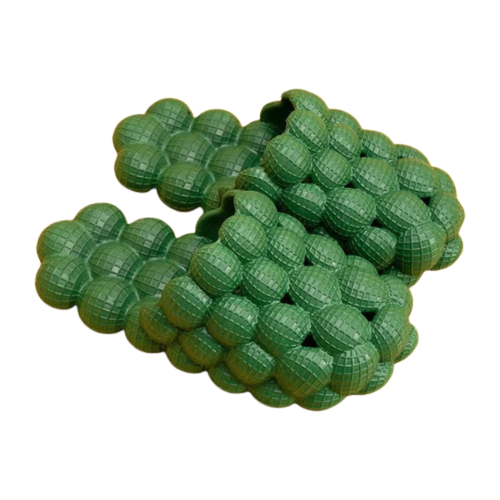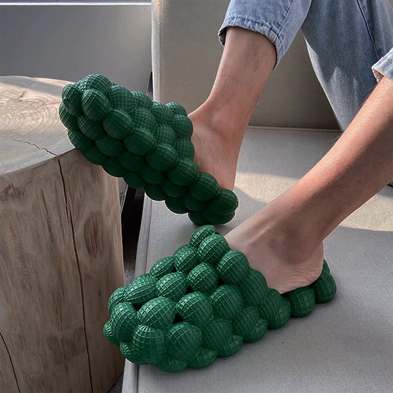 - WHERE COMFY MEETS STYLE!: Learn why thousands of customers have shopped with us (the official provider) & why they say that Green Bubble Slides are the most comfortable slides they own. You’ll be shocked at how quality our Bubble material is! They are sure to feel like you’re walking on fluffy clouds!